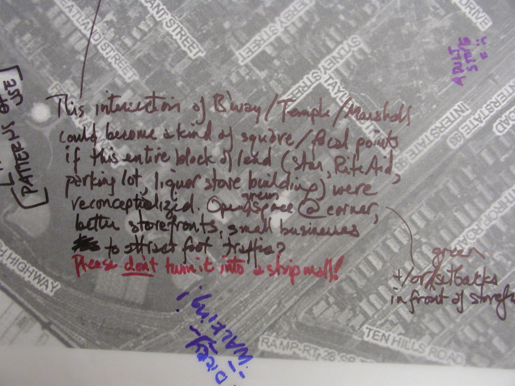 Interactive group exercises got people talking. First, small groups prepared their own neighborhood maps, using trace paper and magic markers to document where things are working well, and where improvements can be made. There were nine groups, and several common themes can be seen on the colorful maps. You can get a flavor of the comments in the images below, and our staff will type everything up into a spreadsheet over the next week or so.