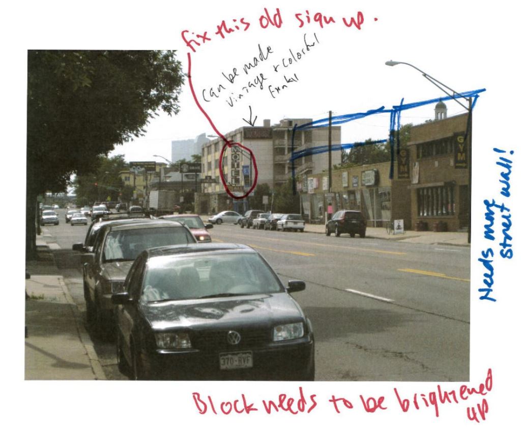 The second activity was to build a photo album. Each small group was given the same stack of 37 photographs. The photos showed different types of street scenes and buildings, some from Somerville, and some from other communities. Participants were asked to mark up these photos, highlighting elements of the scene that they liked or didn’t like. The main question was: is this scene consistent with your vision for the future of the neighborhood? You can see scanned versions of participants’ work below. Over the next couple of weeks, we will transcribe everything and format it in a booklet like the one that was created for the Green Line Station Area Planning Series in 2012.